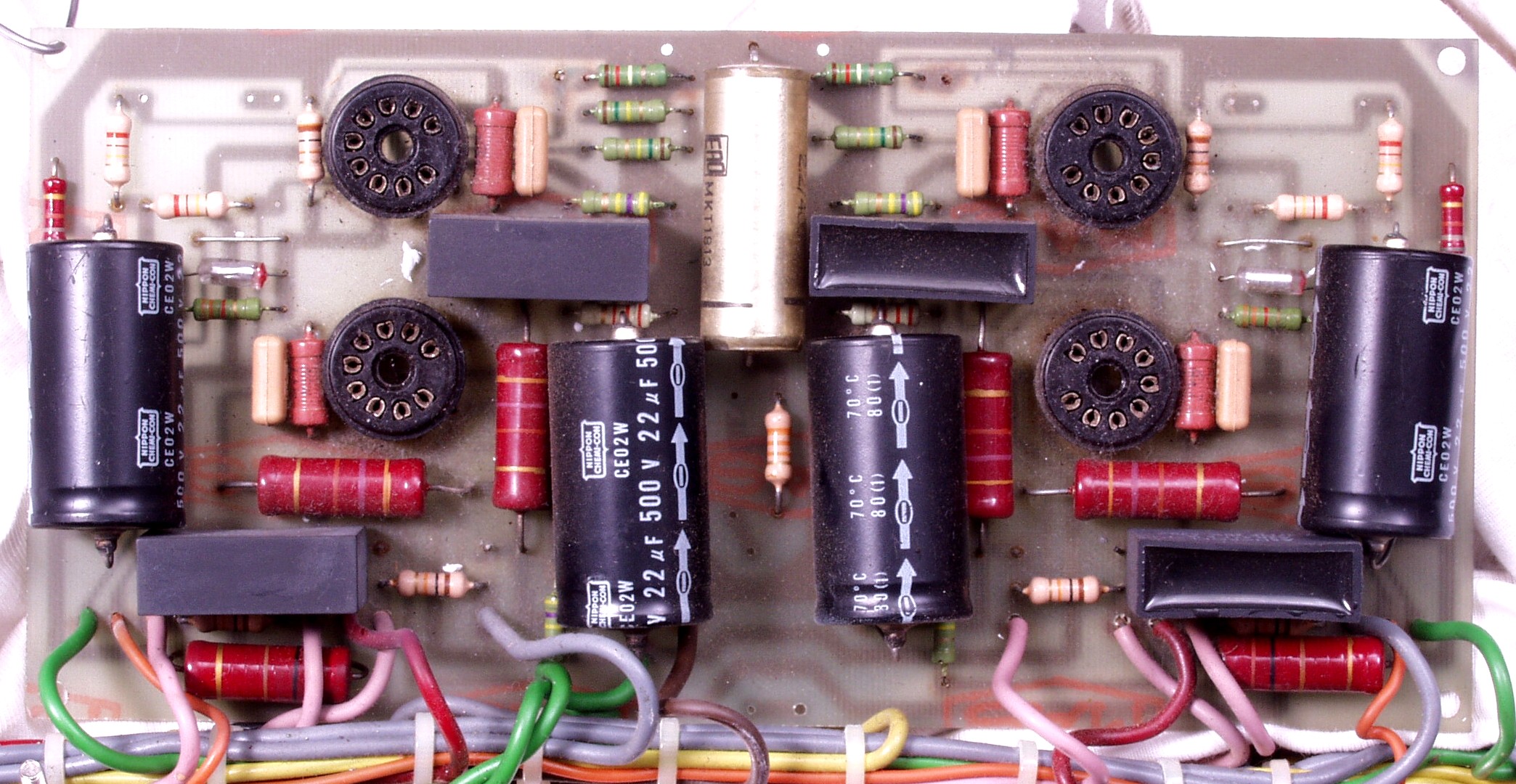 C12. 修理後 前段AMP基板 真空管ソケット4個、電解コンデンサー5個、フイルムコンデンサー4個交換