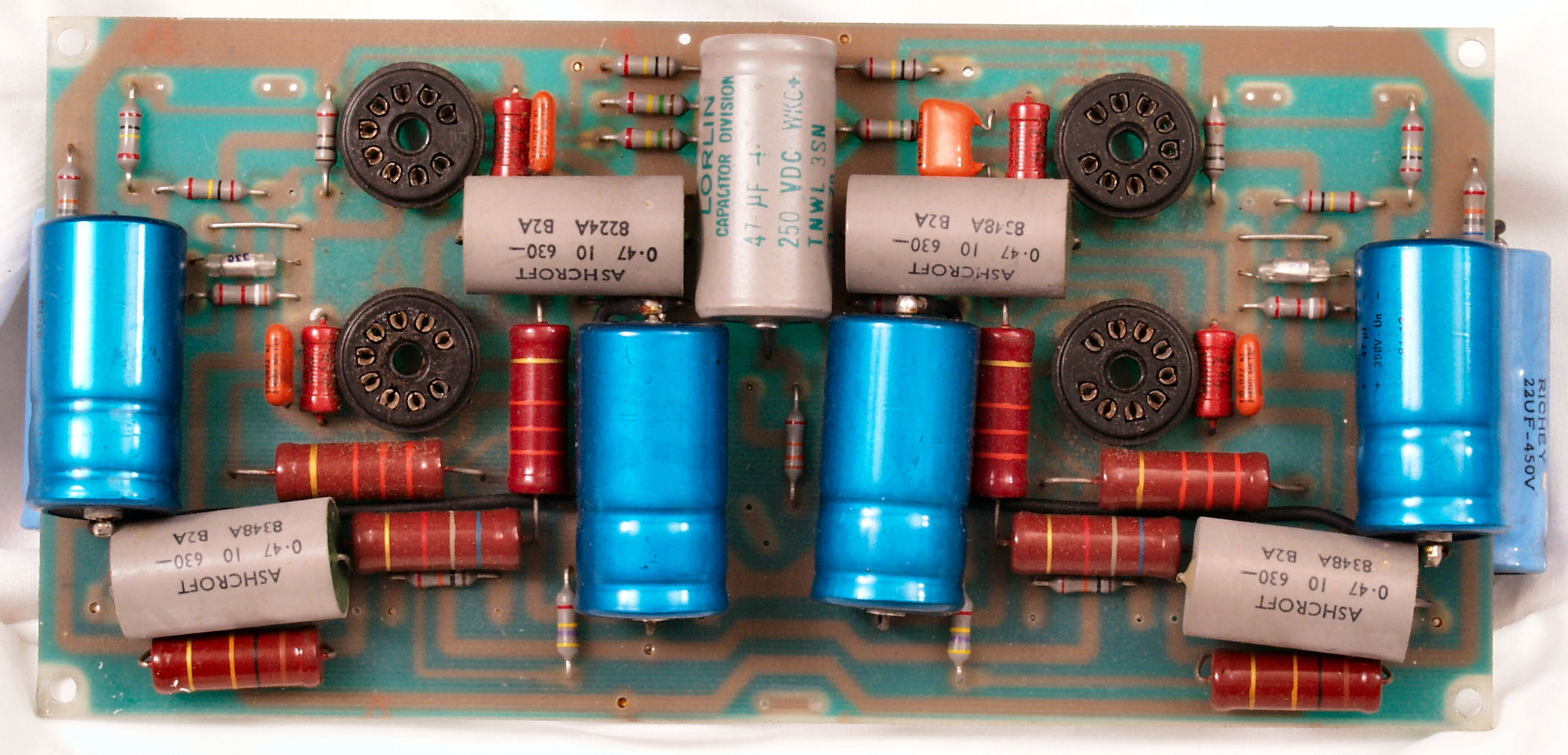 C12. 修理後 前段AMP基板 真空管ソケット4個、電解コンデンサー5個、フイルムコンデンサー4個交換