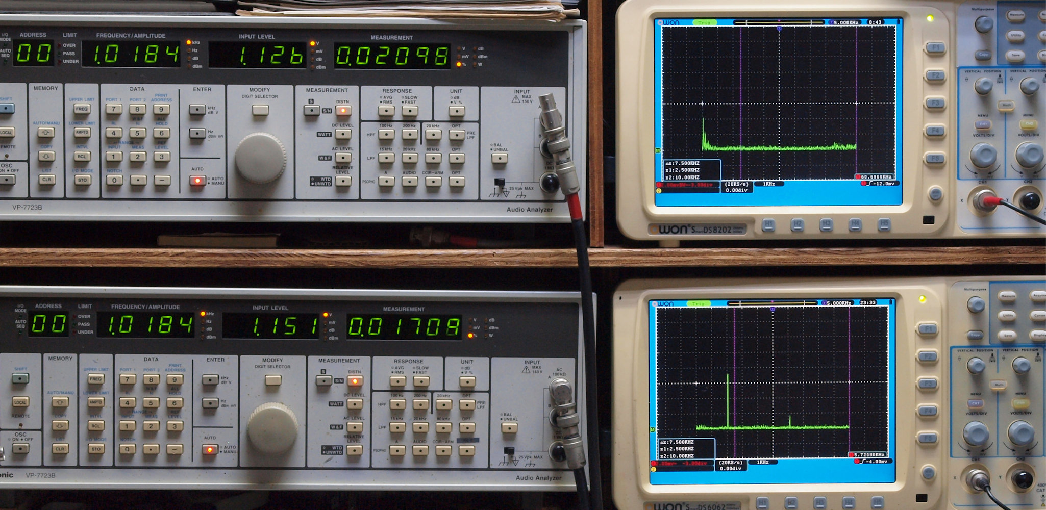 よって、ダイアル設定出力レベルより低くなります。測定機器の仕様や整備の様子はこちら、「VP−7723B」「VP−7201A」。 FFT画面の見方はこちら。