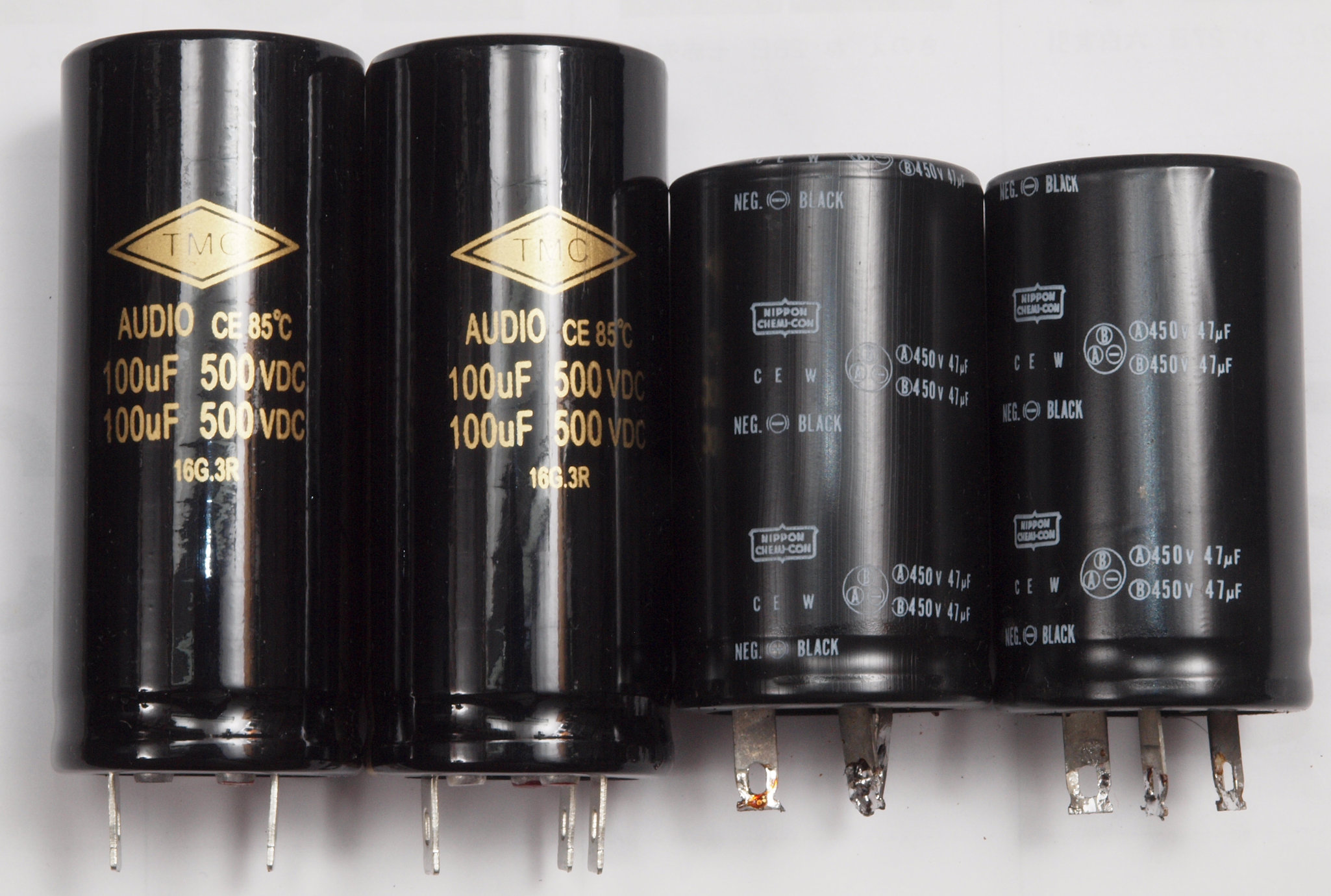 | AC3. 点検中 電源ブロック電解コンデンサー比較、下記から選択可能。 左=「TMC」100μ×2/500WV、右=「JJ」100μ×2/500WV。 |